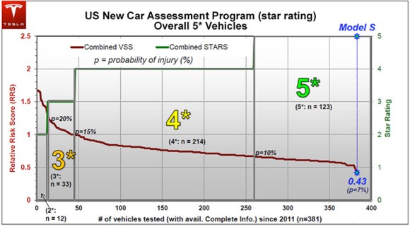 На графике показан показатель статистического относительного риска (Relative Risk Score, RRS) для модели Tesla S по сравнению с другими автомобилями по стандарту NHTSA 2011.