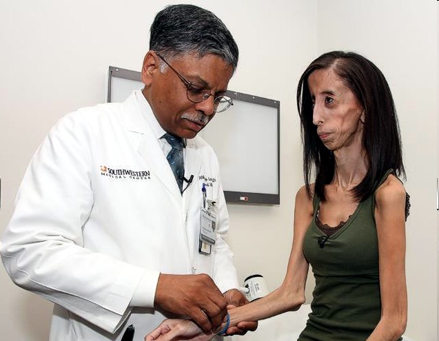 Лиззи родилась с необычным синдромом — ее организм не усваивает жиры. Для того, чтобы не умереть, ей нужно есть каждые 15 минут. Сейчас ее рост — 152 см, а вес всего 25 кг. Она слепа на один глаз. Ее организм настолько хрупок, что любая болезнь может стать для нее смертельной.