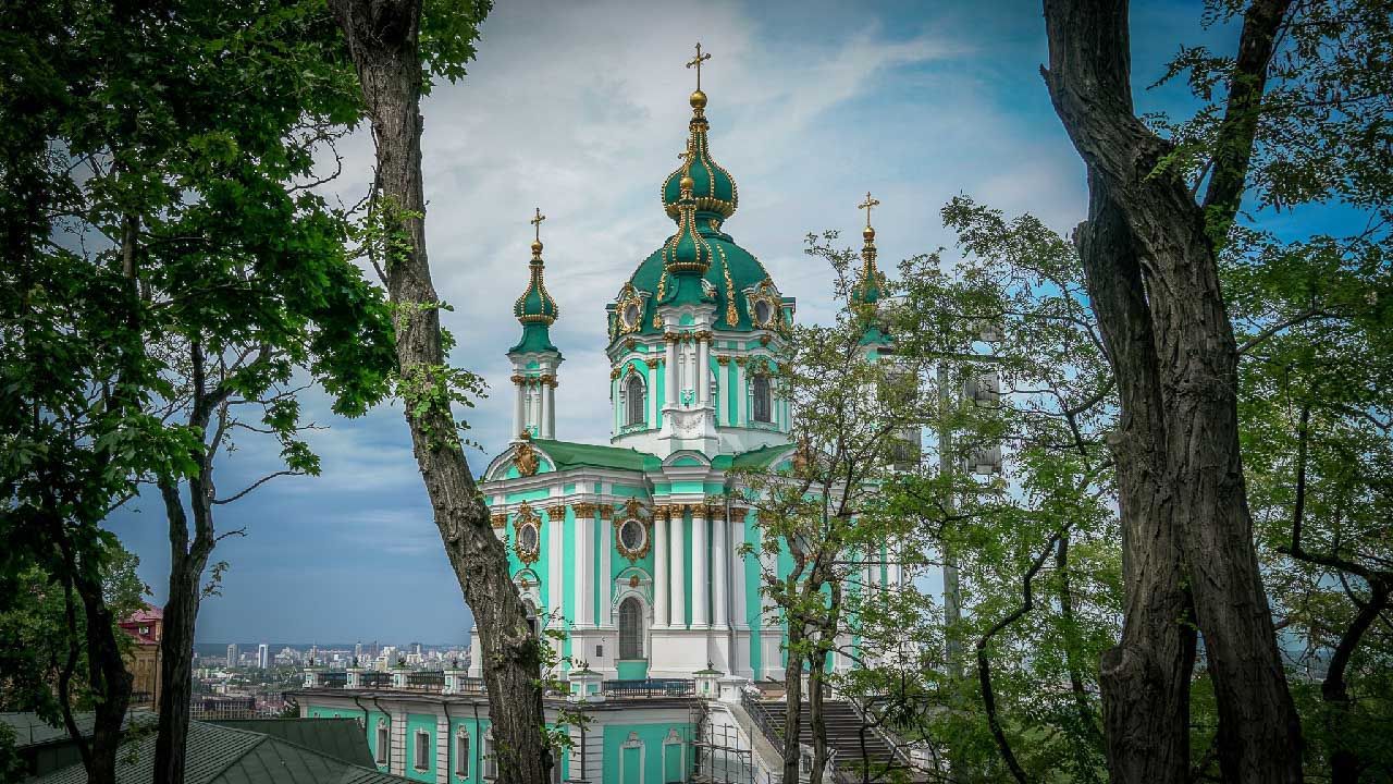 На этом снимке красочная Андреевская церковь, кажется, выпрыгивает из города.