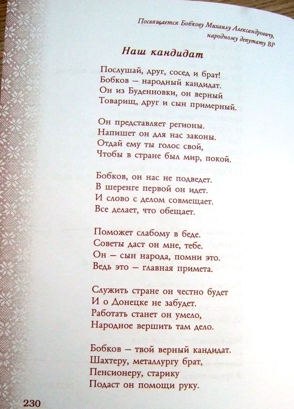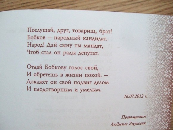 В сборнике также были представлены стихи, посвященные народному депутату Украины, члену Партии регионов Александру Бобкову.