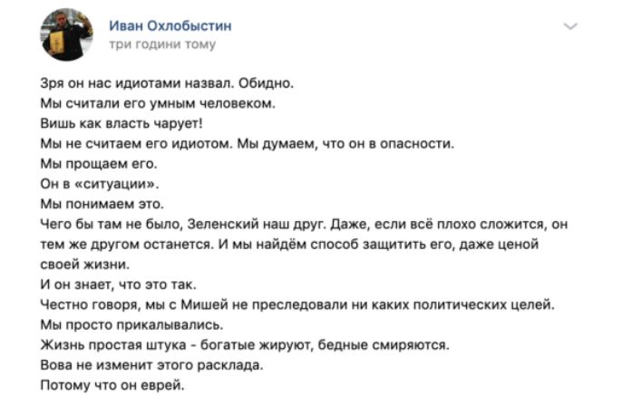 «Жизнь простая штука — богатые жируют, бедные смиряются. И Вова не изменит этого расклада. Потому что он еврей. Он должен делать, что они скажут, иначе его убьют. Мы понимаем это...Другое дело — нафиг еврею лезть в наши ордынские склоки? Конечно, у нас своих жи*ов полно. Но они наши. А те, которые его поддерживают — не наши. Убьют они его. Если бы я был евреем, то был бы Коломойским. Красивый персонаж. Отметьте: не деньги для него главное», — добавил он.