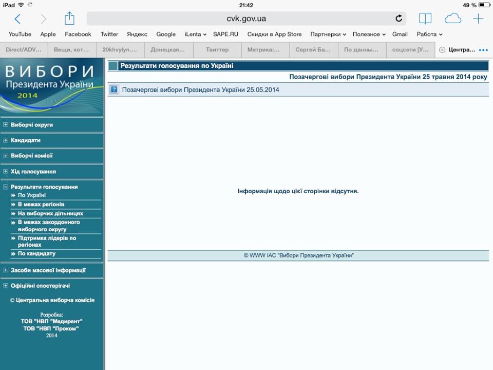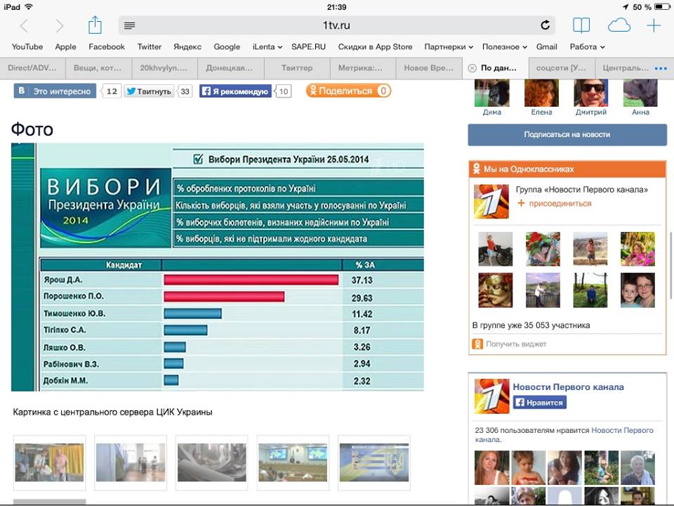 В эфире российского «Первого канала» был показан скриншот якобы с сайта Центризбиркома Украины, на котором Дмитрий Ярош набирает 37% голосов и является фаворитом прошедших 25 мая внеочередных выборов президента.