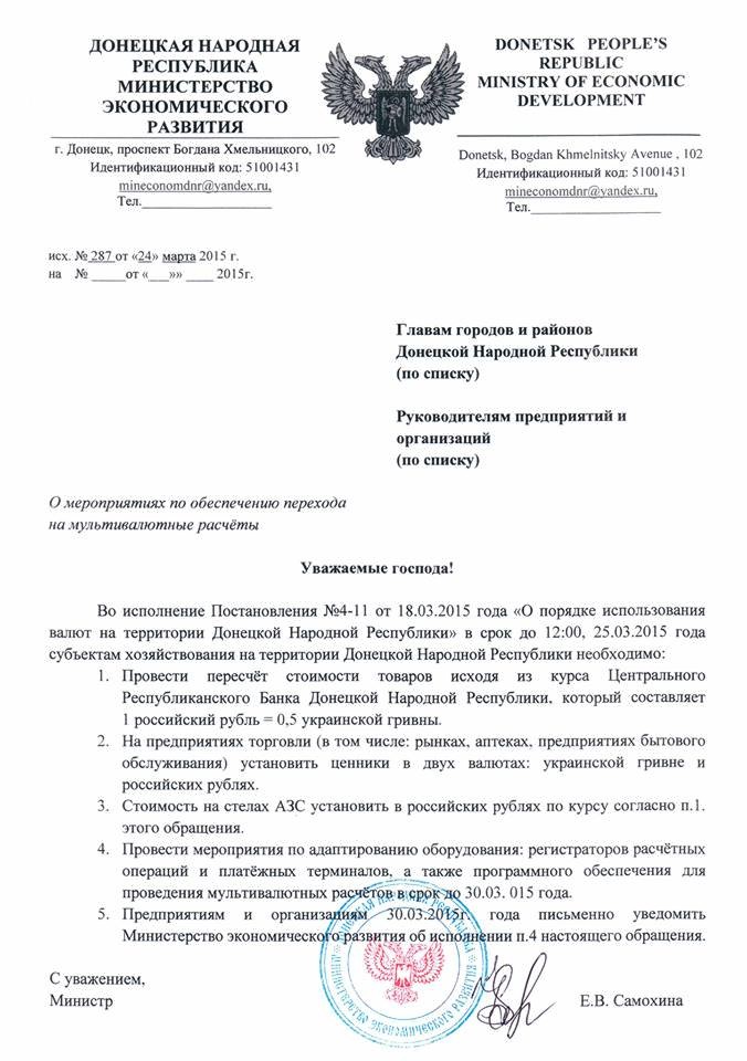 Письмом, подписанным «министром» Самохиной, предписывается произвести расчет стоимости товаров в российских рублях по курсу 1 рубль = 0,5 грн.