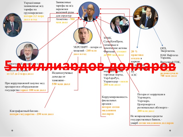 Главные виновники коррупции в стране, по мнению Саакашвили, — Ахметов (коррупция на железной дороге), Мартыненко, Иванчук, Жвания, Коломойский («Укрнафта»), и Фирташ.