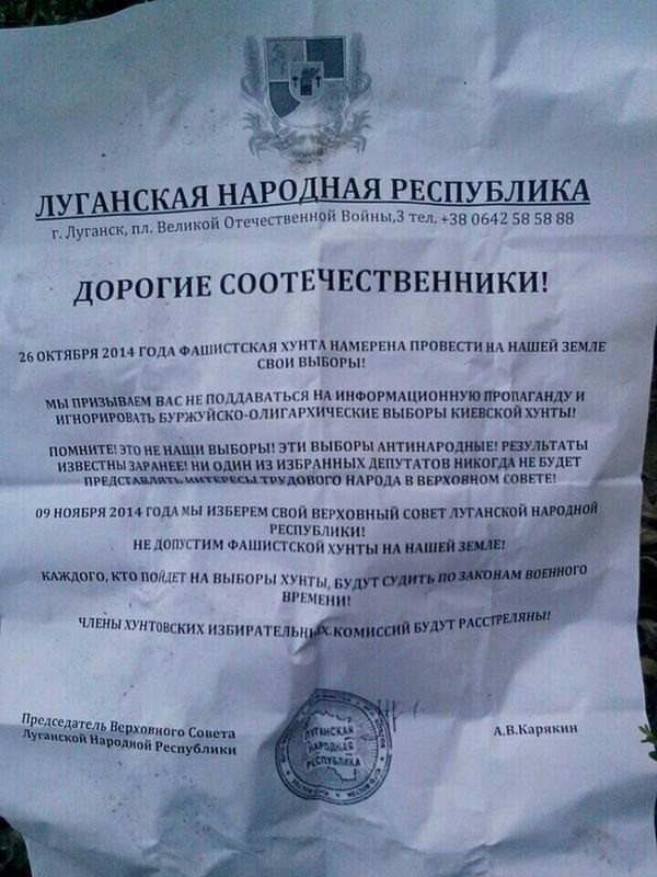 Также в листовках содержится сообщение о выборах в «Верховный совет Луганской народной республики», которые сепаратисты наметили провести 9 ноября.
