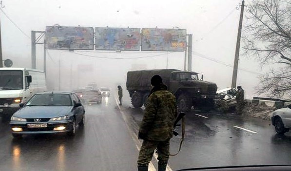 Сегодня, 23 января в оккупированном Донецке произошло сразу два ДТП с участием военной техники террористов и гражданского транспорта.