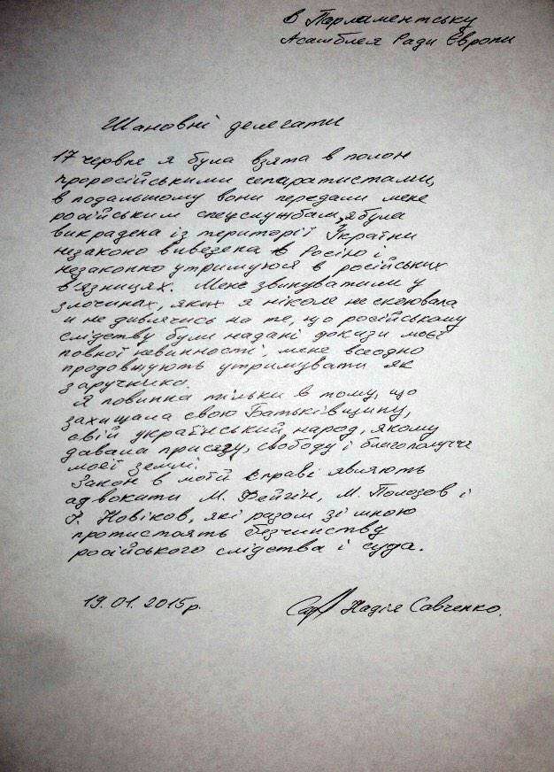 В письме Савченко напоминает, что 17 июня 2014 года ее взяли в плен пророссийские сепаратисты и позже передали российским спецслужбам.