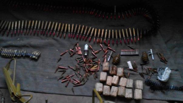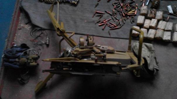 Отмечается, что сотрудники спецслужбы изъяли из тайника одну боевую разведывательно-дозорную машину (БРДМ), 2 прибора наведения для гаубиц, 2 гранаты Ф-1, 12 магазинов к РПК, большое количество патронов различных калибров, подставку для АГС, 6 приборов наведения к РПГ-7, 67 бронежилетов, 42 кевларовые каски и 21 портативную цифровую радиостанцию.