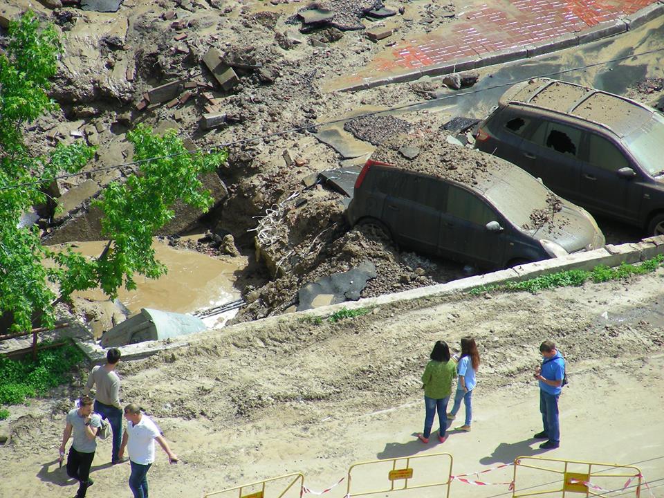 Как сообщают очевидцы, около 14:15 внезапно из под земли ударил столб воды высотой до 5-го этажа. Из образовавшейся промоины хлынули потоки воды вместе с грязью. Пострадали припаркованные рядом автомобили, а также фасад жилого здания и офисные помещения на 1-2 этажах и застеленные лоджии на 3-м этаже. В них выбиты стекла.