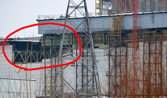 Обрушение железобетонных панелей (выделено красным контуром) на кровле машинного зала блока №4 ЧАЭС.