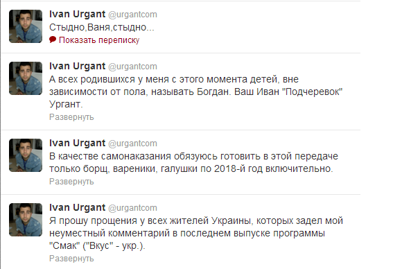 Впоследствии Иван Ургант написал в своем аккаунте в Twitter: «Я прошу прощения у всех жителей Украины, которых задел мой неуместный комментарий в последнем выпуске программы «Смак».