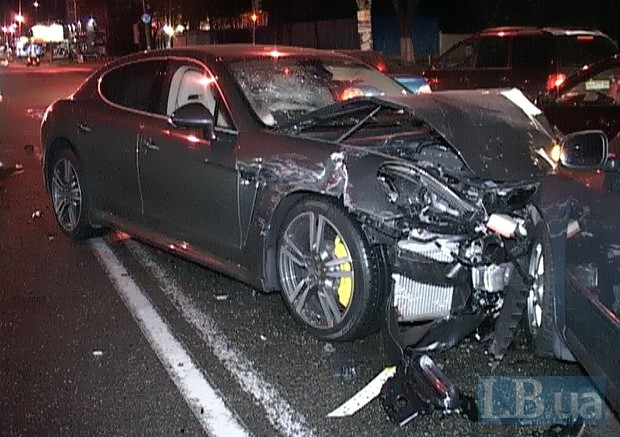 В это время, якобы на «запрещающий» сигнал светофора, со встречной полосы на перекресток выехал Porsche и на полном ходу протаранил Subaru в правый бок. Свидетели рассказывали, что удар был такой силы, что иномарку отбросило на тротуар примерно на 30 м. Тем временем Porsche продолжил движение и врезался в стоявшие перед светофором Volvo, Ford и Jeep.
