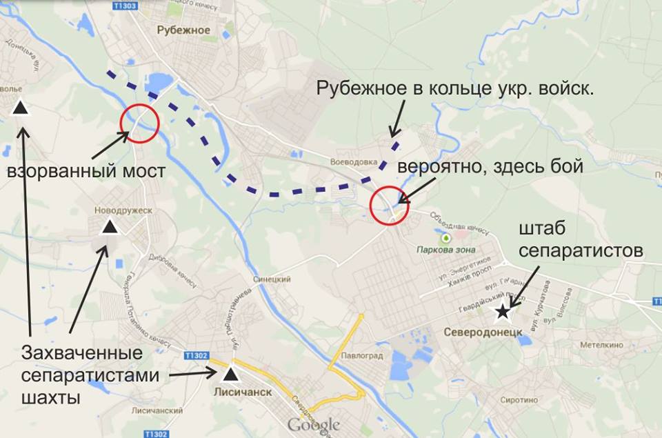Карта боевых действий в окрестностях Рубежного и Лисичанска.