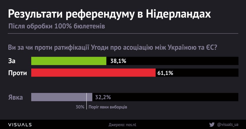 Референдум в Нидерландах, на который был вынесен вопрос «Вы за или против ратификации Соглашения об ассоциации Украины и ЕС», прошел 6 апреля. Он носит консультативный характер, окончательное решение о ратификации Соглашения примет правительство Нидерландов.