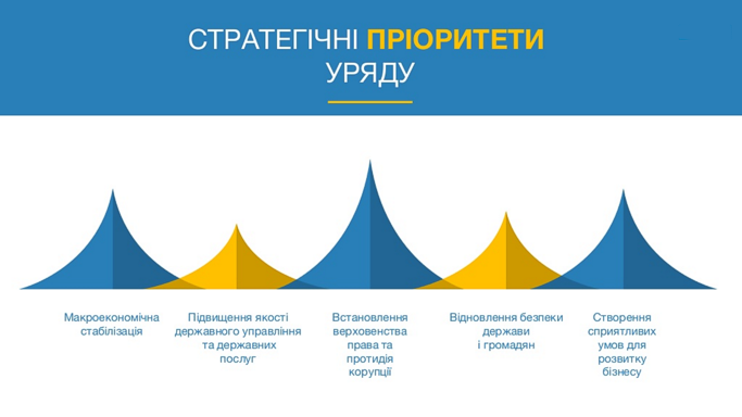 При этом, стратегическими приоритетами Кабмина Украины являются создание благоприятных условий для развития бизнеса и восстановления безопасности государства и граждан, установление верховенства права и противодействие коррупции, а также макроэкономическая стабилизация и повышение качества государственного управления и государственных услуг.