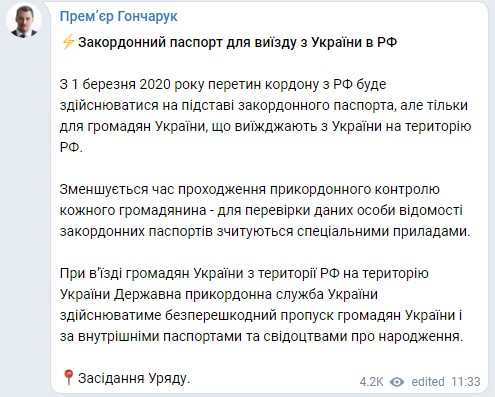 «С 1 марта 2020 года пересечение границы с РФ будет осуществляться на основании загранпаспорта, но только для граждан Украины, которые выезжают из Украины на территорию РФ», — написал премьер.