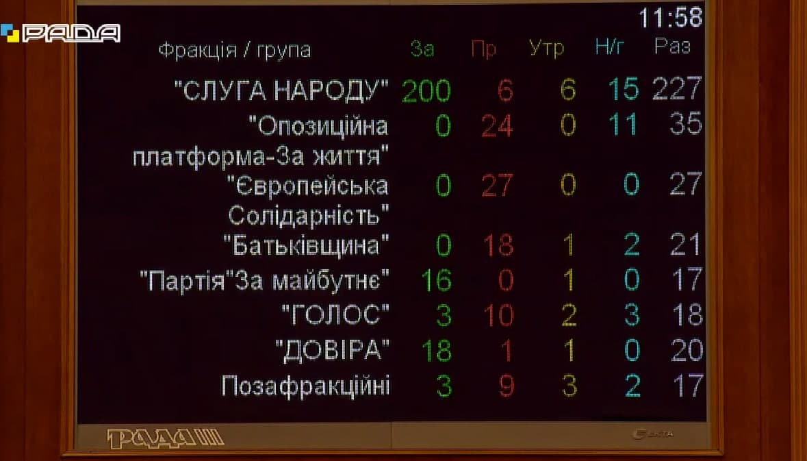 Тем не менее предложение Корниенко поддержали три фракции: «Слуга народа» — «за» 200 голосов, 6 — против; «За майбутнє», — 18 «за», 0 — против и депутатская группа «Довіра» — 18 «за», 1 — против.