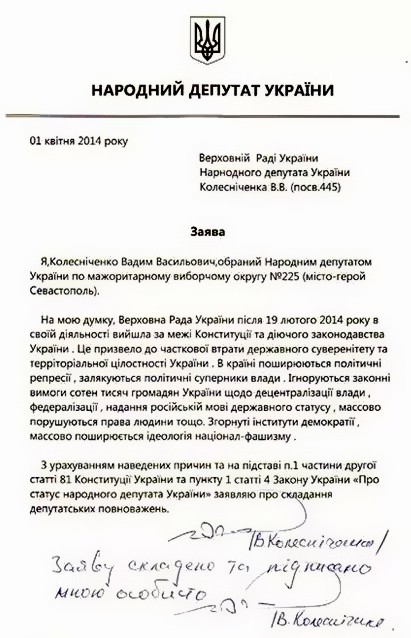 «Друзья, остаюсь верен Вам и своей политической позиции. Подал официальное заявление о сложении депутатского мандата прекратившего свое реальное существование украинского парламента. Считаю, что в это рубежное время каждый должен выбрать на какой он стороне: веры, правды и совести или должностей и денег. Уверен, что победа будет за нами! За нами правда и великая история, честь и вера», — написал Колесниченко.