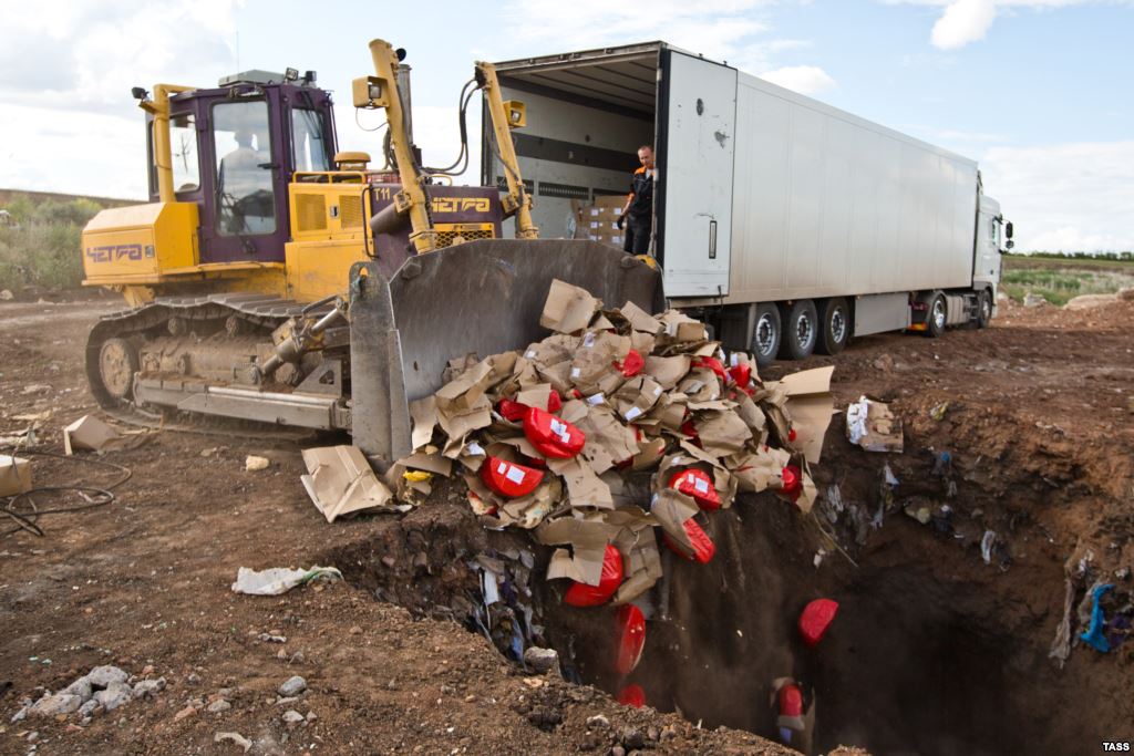 В России активно приступили к уничтожению запрещенных к ввозу продовольственных товаров. Согласно утвержденным российским правительством правилам уничтожения санкционных продуктов, поиск и ликвидацию запрещенных продуктов поручили Федеральной таможенной службе, Роспотребнадзору и Россельхознадзору, причем уничтожению должны подвергаться товары не только на границе, но и по всей территории страны — в магазинах и на складах.