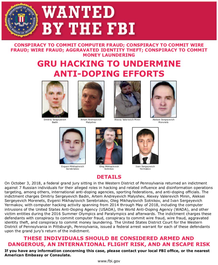 По данным обвинителей, россияне также причастны к кибератакам на ядерноэнергетическую компанию Wstinghouse в Пенсильвании, антидопинговые агентства и их официальных представителей, спортивные федерации и почти 250 спортсменов, а также на Организацию по запрещению химического оружия, которая сейчас занимается расследованием химатак в Сирии и отравлением экс-разведчикао ГРУ Сергея Скрипаля.