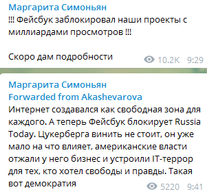 При этом Симоньян подчеркнула, что правила Facebook их компания не нарушали, никаких претензий к ним ни разу не было.