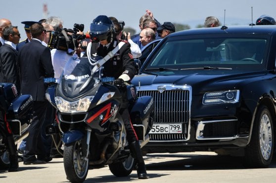 Российский президент передвигается в Риме на собственном бронированном лимузине Aurus Senat.