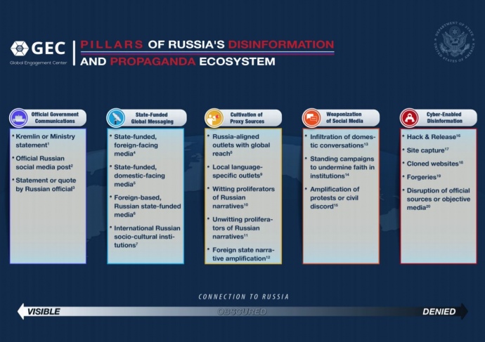 В Госдепе разделили пропаганду и дезинформацию со стороны Кремля на несколько основных источников. В частности, речь идет о 5 столпах российской пропаганды: