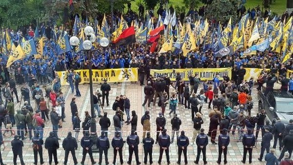 Основное требование участников акции — не допустить проведения выборов на оккупированном Донбассе по «российскому сценарию», в случае если их все же попытаются провести, «азовцы» пообещали «вынести» Раду.