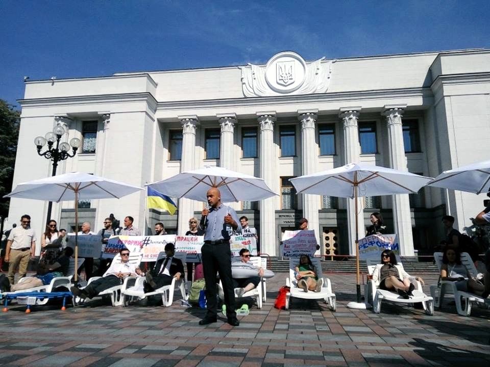 Около 20 активистов расставили на площади перед Радой несколько пляжных лежаков и шезлонгов, установили солнцезащитные зонты, некоторые из протестующих одели на себя надувные камеры для плавания, сообщает «Укринформ».