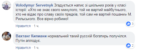 «Вспоминается надпись со школьных лет в классе истории: "Кто не знает своего прошлого, тот не достоин будущего, кто не знает о славе своих предков, тот сам не заслуживает уважения" Максима Рыльского. Все верно делаем!», – написал в комментарии к видео Владимир Серветник.