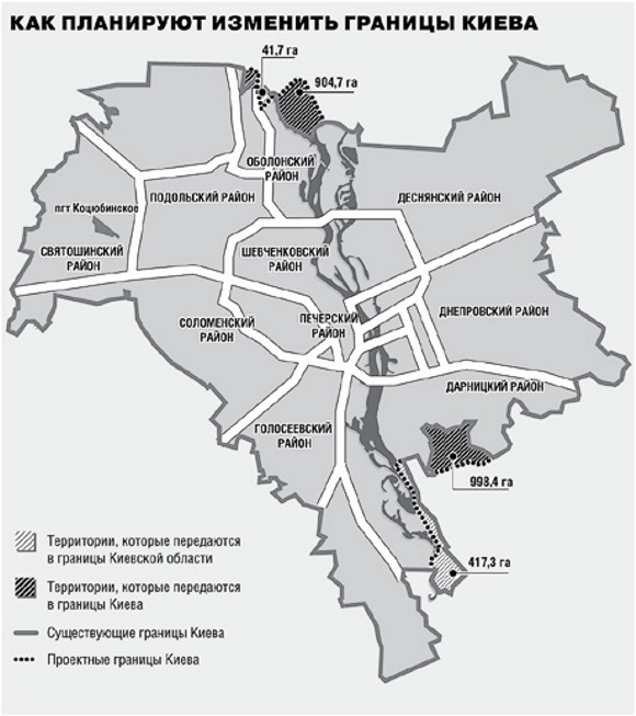 Как пишет «Коммерсант-Украина» со ссылкой на документ, площадь города предлагают увеличить за счет присоединения 2075,7 га территории Киевской области. Больше всего земель планируется забрать у Вышгородского (904,7 га), Бориспольского (998,4 га) и Броварского (73,9 га) районов. Кроме того, поселок городского типа Коцюбинское Киево-Святошинского района тоже будет поглощен Киевом.