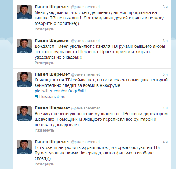 «Дождался — меня увольняют с канала ТВі руками бывшего якобы честного журналиста Шевченко. Просят прийти и забрать уведомление в кадры!!! » — написал Шеремет.