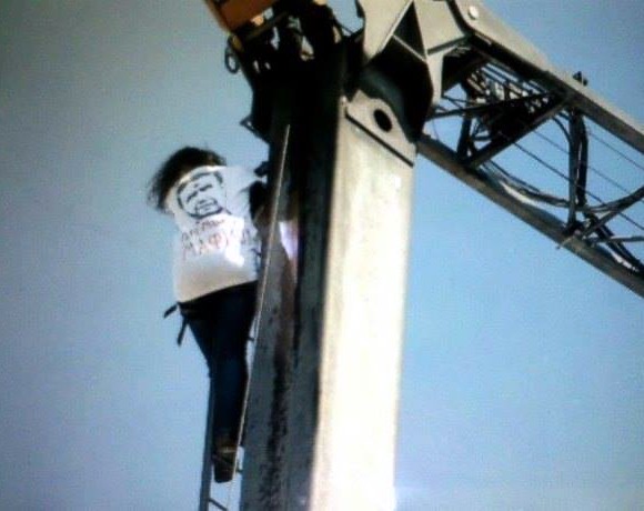 Кабины на кране нет, поэтому протестующие находились на стреле, пристегнутые альпинистскими карабинами.