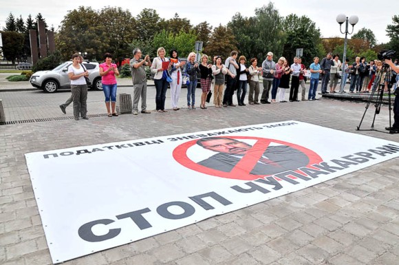 Перед собой они развернули баннер размером 3х6 метра с перечеркнутым изображением министра Министерства доходов и сборов Александра Клименко и надписью «Налоговики нарушают закон. Стоп Чупакабра! ».