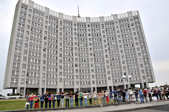 В 12:00 на площади перед областным управлением Министерства доходов и сборов несколько десятков журналистов выстроились в шеренгу, положив руки на плечи друг другу.