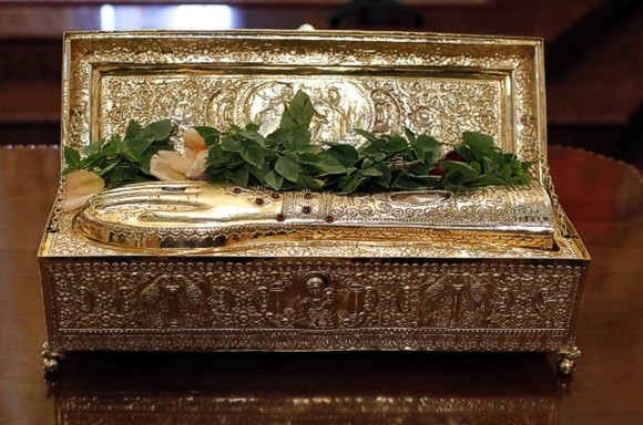 Стоит отметить, что святыня, которая постоянно хранится в монастыре Ксенофонт на горе Афон в Греции, была доставлена в Украину в Успенский собор Киево-Печерской лавры еще 30 октября группой священников Украинской православной церкви Московского патриархата во главе с епископом Бородянским Варсонофием. Вместе с ковчежцем с мощами Георгия Победоносца из афонского монастыря доставлен и список древней иконы X века. Святыню по Украине сопровождает наместник монастыря Ксенофонт архимандрит Алексий.