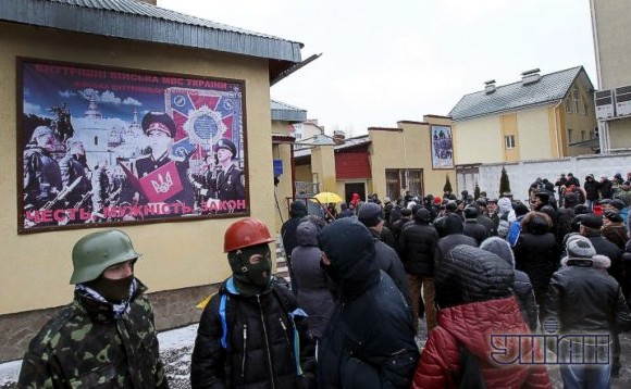 Уже вторые сутки во Львове активисты Евромайдана и простые граждане блокируют выезды военных частей, не давая внутренним войскам и спецподразделениям выехать в Киев.