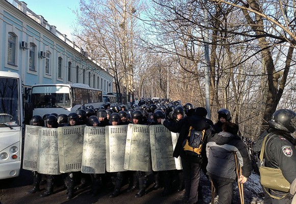 По пути манифестанты провели митинг возле Дома офицеров, а затем направились к улице Грушевского у Мариинского парка, где их встретили кордоны милиции и внутренних войск.