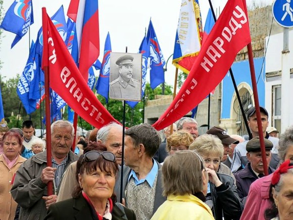 Помимо красных транспарантов с надписями «Да здравствует 1-е Мая», «Пролетарии всех стран соединяйтесь», «Мы делу Ленина верны» и флагов российских партий «Единая Россия» и ЛДПР (Либерально-демократическая партия Жириновского) встречались и портреты Сталина, сообщает Ирина Прокопюк из местной газеты «Кафа».
