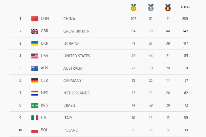 В общем медальном зачете команда паралимпийцев Украины заняла 3-е место, завоевав 117 медалей, из них 41 золотая, 37 серебряных и 44 бронзовых.