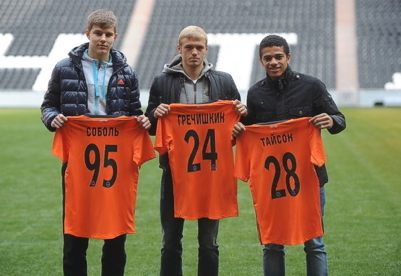 Нужно отметить ажиотаж, который вызвало мероприятие, — конференц-зал был переполнен болельщиками и журналистами. Они впервые увидели в сборе такую компанию: Тайсон, Дмитрий Гречишкин и Эдуард Соболь. Футболки новобранцам лично вручал главный тренер «горняков» Мирча Луческу. Тайсон будет играть в составе «Шахтера» под номером 28, Гречишкин – 24, Соболь – 95.