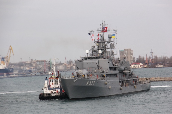«В состав корабельной группы входят флагман — корабль обеспечения «S. MEHMET PASA» ВМС Турецкой Республики, а также противоминные корабли «AYVALIK» ВМС Турецкой Республики, «TAJO» Королевских ВМС Испании и «LUPU DINESCU» ВМС Румынии.