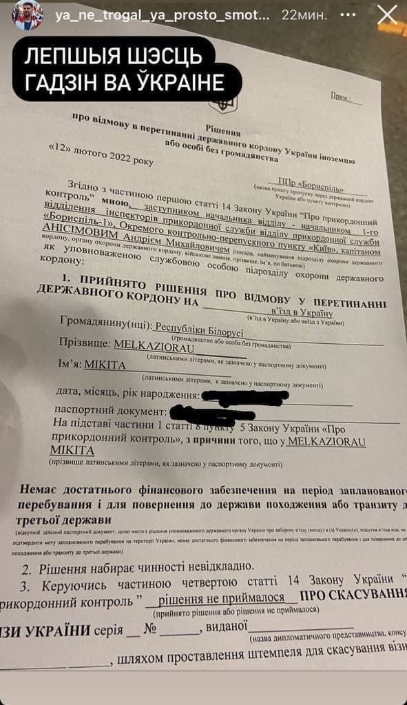Телеграм-канал опубликовал скриншот публикации известного белорусского блогера Никиты Мелкозерова, который рассказал о том, как накануне не смог попасть в Украину. По его словам, ему и еще пятерым гражданам Беларуси было отказано во въезде в Украину после нескольких часов ожидания в киевском аэропорту «Борисполь».
