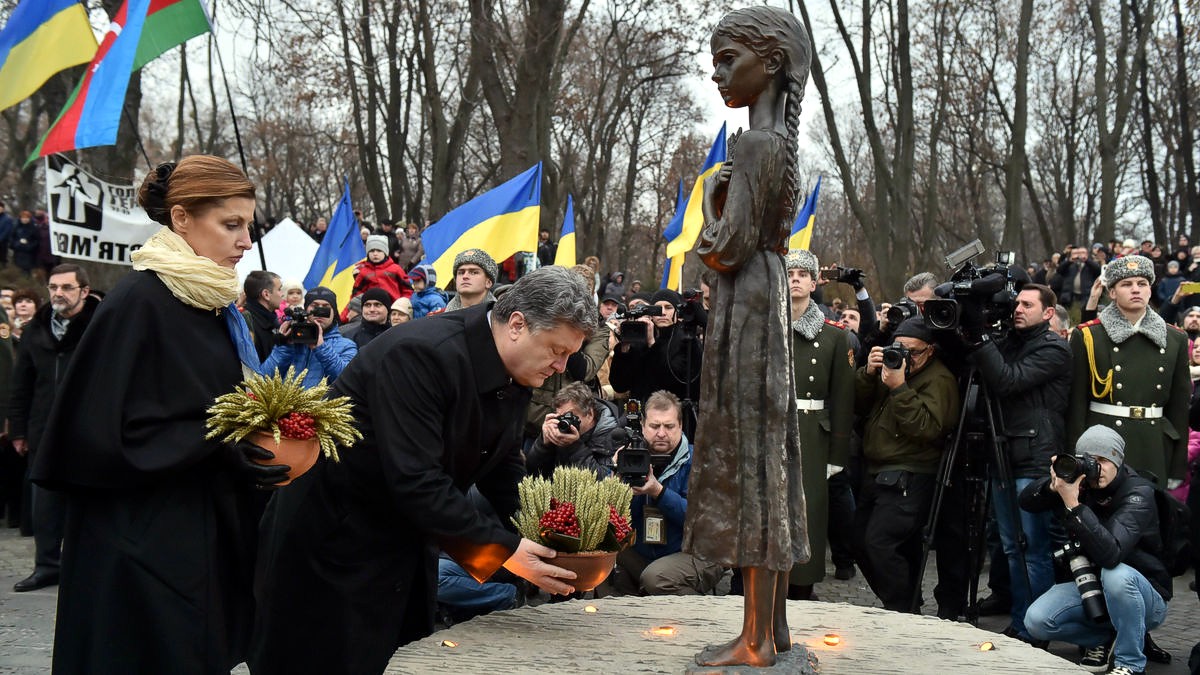 22 ноября Порошенко, в сопровождении своей жены и нескольких чиновников администрации, установил композицию из зерен перед обелиском, выполненном в форме свечи, на берегу реки Днепр в Киеве, чтобы почтить память погибших во время голода, который 28 ноября 2006 года украинский парламент признал геноцидом. Россия долгое время отрицала обвинения в геноциде, называя их «односторонней фальсификацией истории».