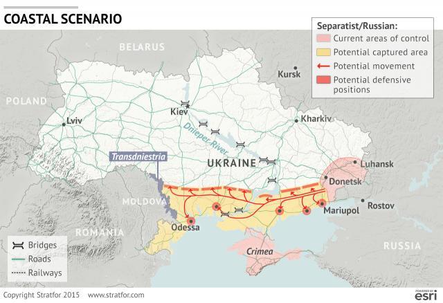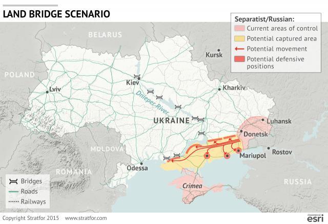 Чаще всего обсуждается вариант с продвижением России вдоль южного побережья Украины с целью соединения Крыма с позициями сепаратистов на востоке. Взяв этот сценарий, мы предположили, что при планировании военной операции будет создан достаточно широкий фронт для того, чтобы получить главный источник водоснабжения Крыма, каким является река Днепр, и что линия обороны будет в максимально возможной степени сосредоточена на Днепре, поскольку это единственная в регионе черта рельефа, пригодная для обороны. Цель такой операции — создать сухопутный мост, чтобы обеспечить снабжение Крыма и не допустить изоляции полуострова в будущем. России придется продвинуться на 400 с лишним километров вглубь территории площадью 46 620 квадратных километров, а также подчинить себе население численностью два миллиона человек.