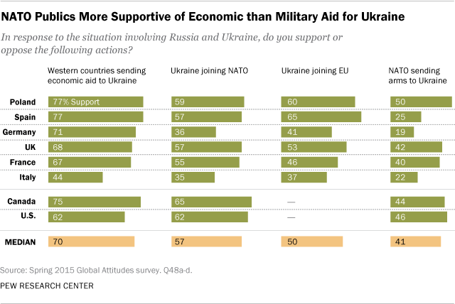 Общественность стран НАТО поддерживают идею оказания экономической помощи Украине, но выступают против предоставления ей оружия. Большинство опрошенных жителей стран НАТО (в среднем 70%) одобряют предоставление странами Запада экономической помощи Украине. Многие при этом поддерживают идею вступления Украины в Евросоюз. Однако жители этих стран-членов НАТО решительно высказываются против предоставления Украине оружия — в среднем помощь оружием поддерживают лишь 41% респондентов. Наиболее отрицательно относятся к предоставлению оружия Украине жители Германии, Испании и Италии, в поддержку такого рода помощи гораздо чаще высказывались жители Польши, США и Канады.