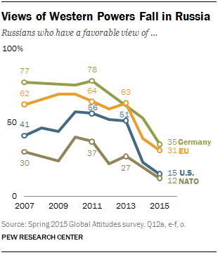 В 2015 году к Америке хорошо относятся лишь 15% россиян, а в 2011 году такого взгляда придерживались 56% граждан страны. Количество россиян, положительно относящихся к Германии, составляет около трети населения (35%), что в два с лишним раза меньше, чем в 2011 году. Подобное ухудшение отношения к странам ЕС и НАТО отмечается в последние годы и среди россиян.