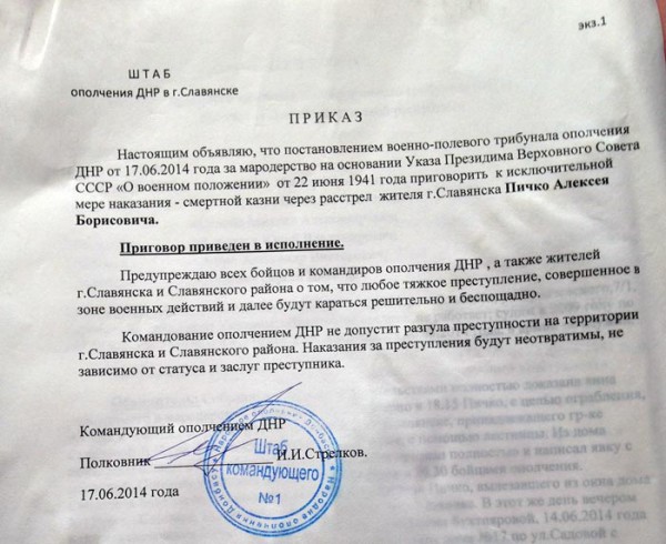 «У нас действовал военный суд, и было введено законодательство 1941 года, введенное Сталиным. На основании этого законодательства мы судили, осуществляли суды, расстреливали. Всего было расстреляно за время моего пребывания в Славянске четыре человека. Двое за мародерство среди военнослужащих, один за мародёрство местный, и один за убийство военнослужащего, идейный правосек» — рассказывал Стрелков в эфире радио «Комсомольская правда».