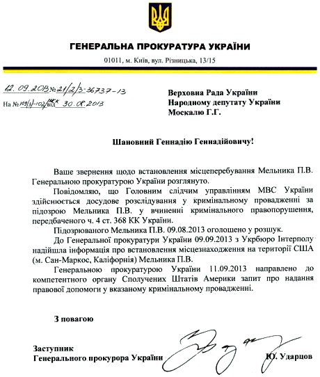 В ответе ГПУ сказано, что 9 сентября 2013 года с Укрбюро Интерпола в Генпрокуратуру поступила информация о том, что местонахождение Петра Мельника на территории США установлено — это город Сан-Маркос, штат Калифорния.