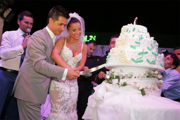Церемония началась около 20.00. Гости пили коктейли под чарующие звуки скрипки и виолончели - музыканты играли бессмертный хит Фрэнка Синатры My Way. Первым появился жених, а следом невеста - в роскошном платье от дизайнера Екатерины Шаховской с пятиметровым шлейфом, расшитым кристалами Swarovski и букетом нежных белых роз. Вели торжество на двух языках – русском и турецком. Процесс вручения подарков молодым занял целых полтора часа! Первый свадебный танец молодожены исполнили под хит Уитни Хьюстон «I will always love you».
